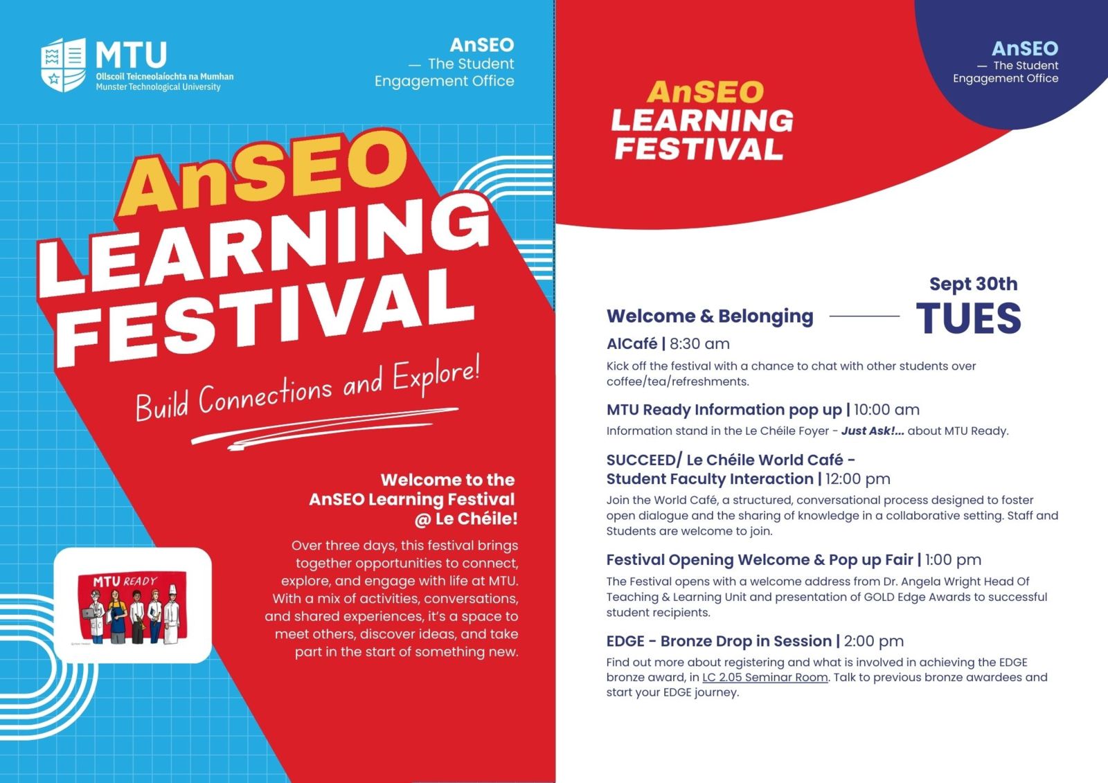 The AnSEO Learning Festival is a three–day celebration of learning, connection, and innovation at MTU. Hosted in the new Le Chéile building, the festival highlights AnSEO programmes and sparks conversations about the big issues shaping student learning In MTU today.
